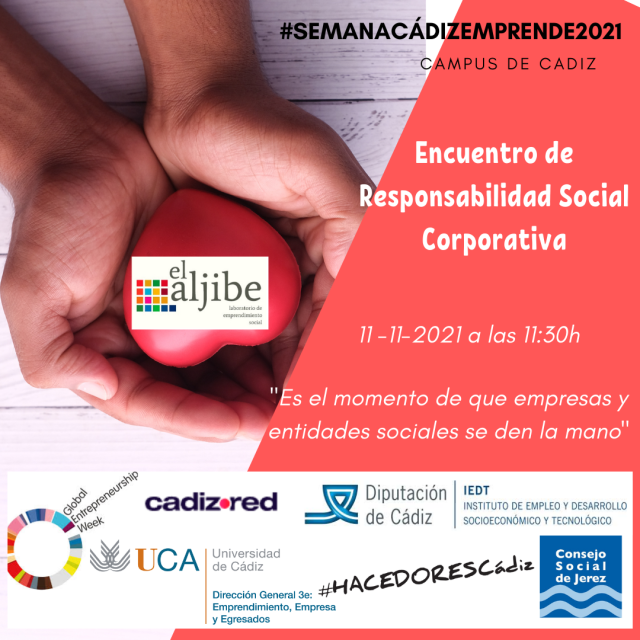 En el marco de la Semana Global del Emprendimiento de la UCA, el laboratorio de emprendimiento social «El Aljibe», organiza este encuentro con el que se pretende crear un espacio en el que empresas y entidades sociales puedan conocerse, conversar e iniciar juntos un camino.